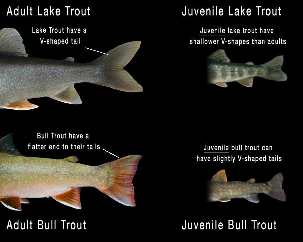Anglers need to be sure you are keeping only lake trout. If you keep a bull trout by mistake you can be cited and fined. So go through the lake trout identification tips by clicking on the buttons below. That way you’ll know how to ID lake trout.